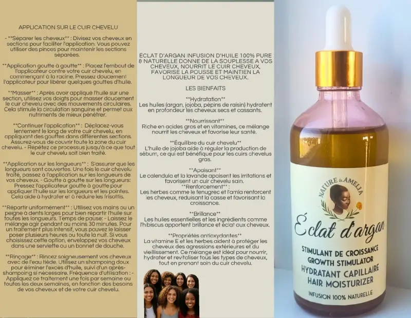 Éclat d'argan infusion d'huile 100% pure & naturelle donne de la souplesse a vos cheveux, nourrit le cuir cheveux, favorise la pousse et maintien la longueur de vos cheveux.